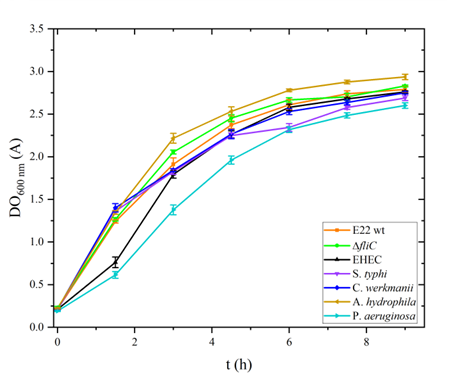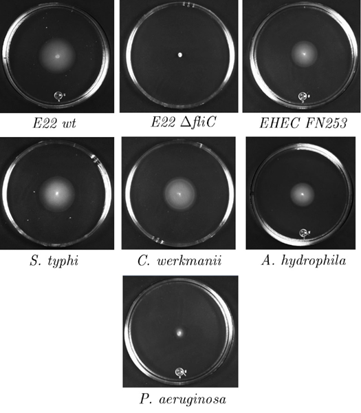Los experimentos realizados de microorganismos en suspensiones acuosas diluidas en nuestro laboratorio fueron con las siguientes cepas: Escherichia coli enterohemorrágica que infecta humanos (EHEC FN253), Escherichia coli enteropatógena que infecta conejos (EPEC E22wt) y su mutante isogénica que no expresa flagelo (EPEC E22ΔfliC), Salmonella typhimurium (S. typhi), Citrobacter werkmanii (C.werkmanii), Aeromona hydrophila (A. hydrophila) y Pseudomona aeruginosa (P. aeruginosa). Contamos con caracterizaciones morfológicas cualitativas de todos los sistemas tales como: Cinética de crecimiento, Ensayos de Motilidad, Cultivos en cajas de Petri y Microscopia óptica. La caracterización morfológica de los microrganismos nos permitió definir los parámetros requeridos en el esquema de simulación numérica.